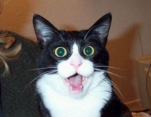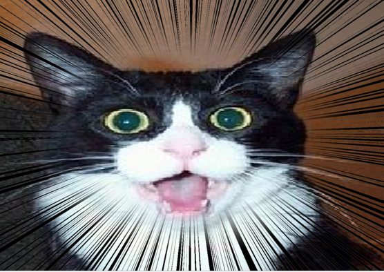 猫がびっくりしていますね(^-^)この表情からだけでも驚いていることはわかるのですが、右側の効果線が使用されている写真の方が同じ表情でも、もっとびっくりしている様に見えませんか?