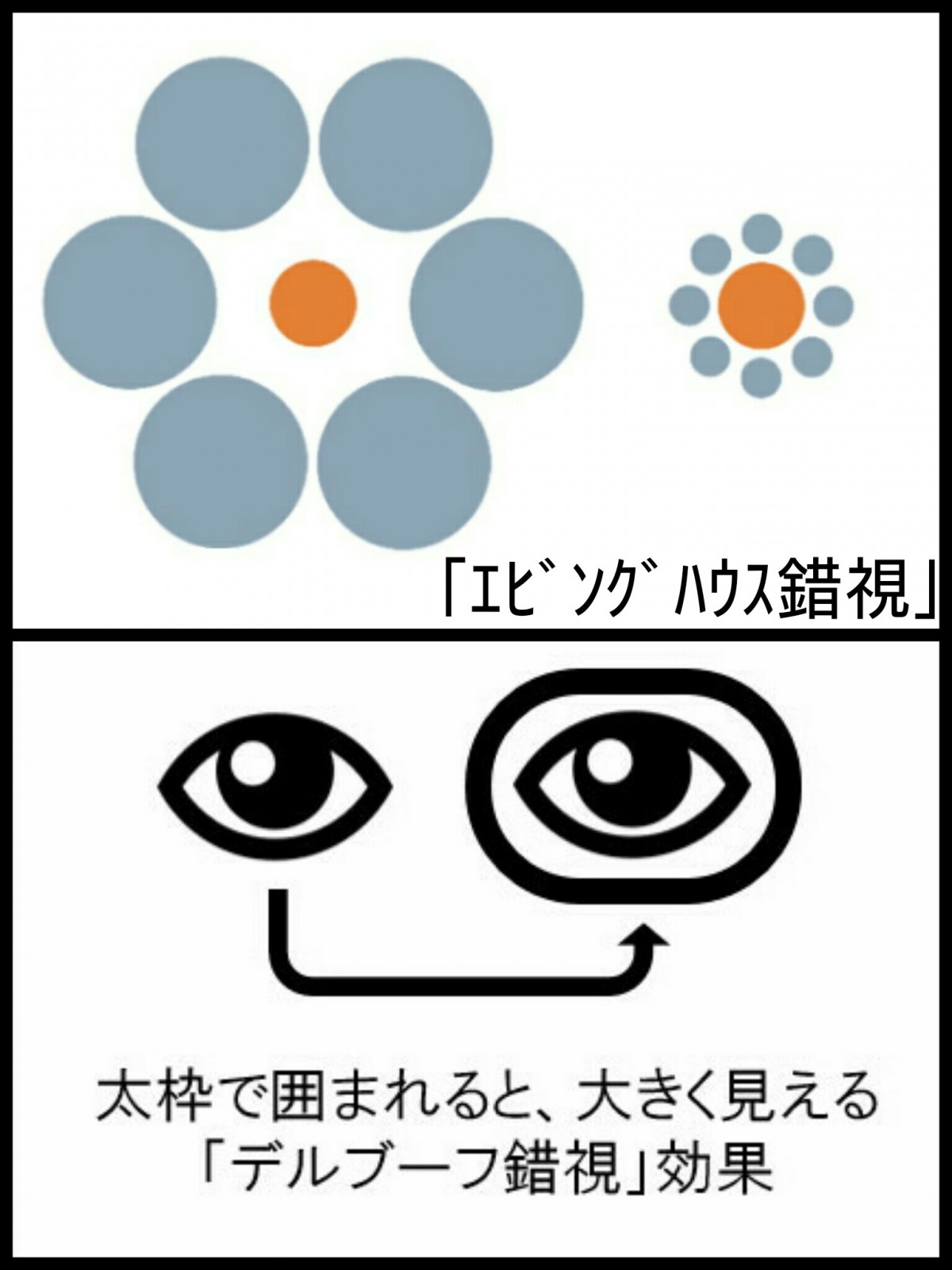さて、画像をご覧下さい。同じ大きさの二つのオレンジ色の円は、左の方が小さく見えませんか?周りにあるものが大きいほど、内側の円が小さく、逆にまわりが小さいと内側の円が大きく目立って見えてきますね。