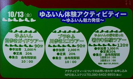 アクティビティーは [ゆふいん街歩きガイドツアー(90分)]・[ブラゆふ川歩きエコツアー(90分)]・[ゆふいんの桜の木を使った箸作り体験ツアー(120分)]の3種類です。