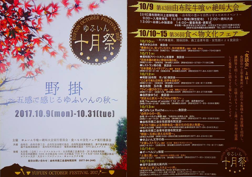 本日9日(土)から始まり、特に10月10日(火)~15日(日)の期間中には「第36回食べ物文化フェア」が開催されます。「食べ物文化フェア」では、湯布院の飲食店さんで開催される食談会、美味しいものを楽しむイベントなどがあります♪いつもと違うお料理が楽しめたり、食に関わる講師の方のお話を聞くことができたり…貴重な体験ができるので、食に興味がある方はぜひチェックしてみてくださいね!それぞれ参加費・定員がありますので、気になるかたはお早めにお問合せしてみてください。