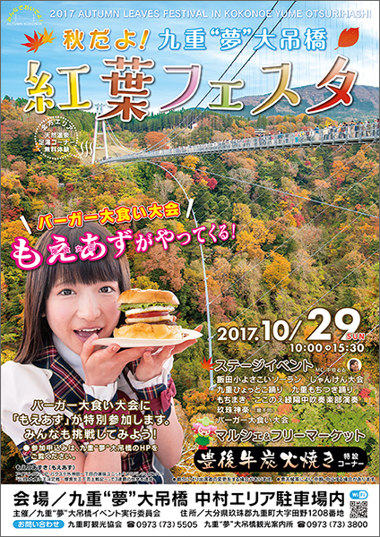 「紅葉フェスタ」ではイベントも沢山あり、じゃんけん大会や、餅まき、バーガー大食い大会(ゲストではもえあずさんが登場!)、バザー、足湯などその他にも様々な出し物・お店があるようです!ぜひ紅葉もイベントも楽しんでみてくださいね!車での移動が40分程なので、湯布院観光と合わせて【九重“夢”大吊橋】に行かれる方も多いようです!ぜひ旅のスケジュールに入れてみてください(^^)/