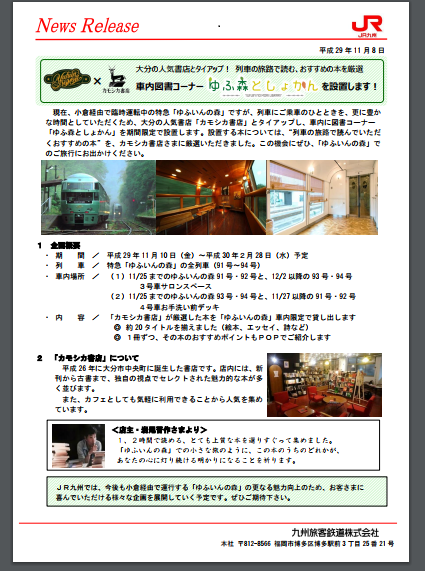 11月10日から、特急「ゆふいんの森」の中に期間限定で、図書コーナー「ゆふ森としょかん」が設置されています。大分の人気書店「カモシカ書店」さんとタイアップし、絵本やエッセイなどオススメの本が貸し出しされるようです。