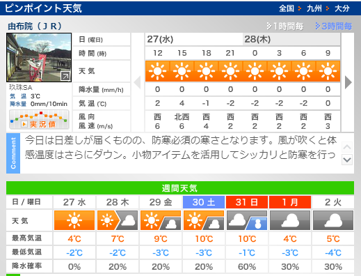 今日の湯布院は晴れです。寒いのでコートやマフラー、手袋など防寒対策をしてお越し下さいね。