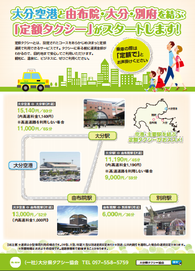 昨年12月16日(土)より、JR由布院駅から大分空港、大分駅、別府駅の各区間を結ぶ定額タクシーの運行が始まっています!ご乗車の際に、「定額で」とお伝えいただくと良いそうですよ。タクシーに乗る前に運賃金額が分かるので、目的地まで安心ですね☆