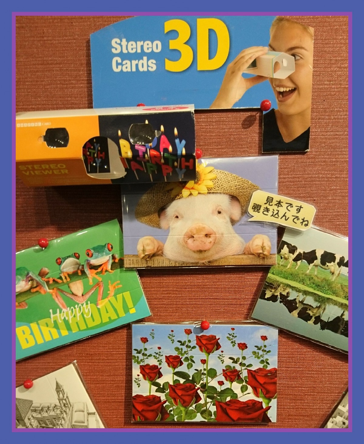 通常は、ポストカードの大きさで折りたたまれていて、メッセージも書けるので、プレゼントにもオススメです。貰った方は、開いて、折り線通りに折ってみるとメガネが出来上がります。メガネを覗いてみると中は、、3Dの絵を見ることができます!もちろん、ご自身で使われても楽しいですよ☆