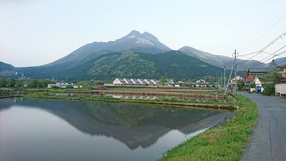 湯布院のシンボル由布岳は、田んぼに水が張られる時期に、水面に映る「逆さ由布」を見ることができます。