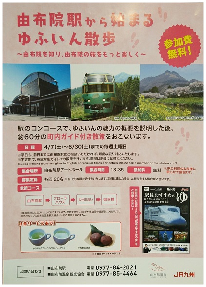 6/30(土)までの毎週土曜日、駅のコンコースで、ゆふいんの魅力概要の説明を聞いて、その後は約60分、町内をガイド付きで散策します。