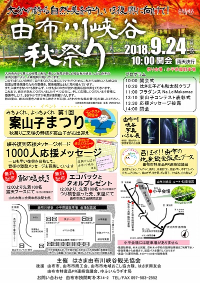 本日は由布市のイベント情報です。9月24日(月・祝)に由布川峡谷で秋祭りが開催されます!由布院駅から車で40分程の所です。峡谷は現在入峡規制となっていますが、お祭りはつり橋近くの駐車場で行われます。