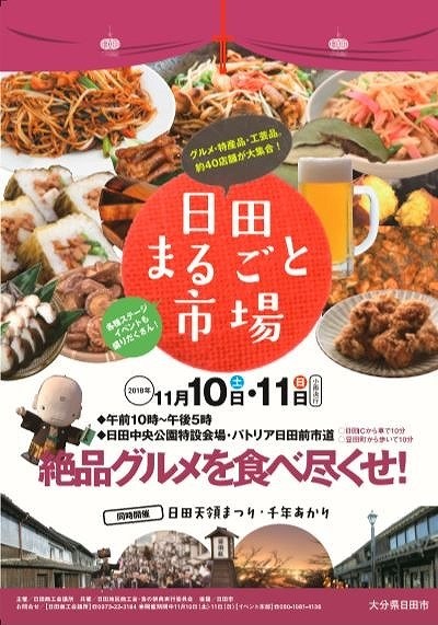 「日田まるごと市場」は、日田のグルメ・工芸品など約40店舗が一堂に会し日田の魅力溢れるイベントです。