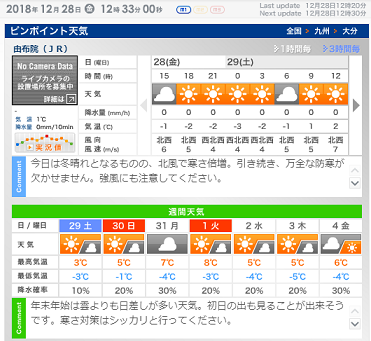 本日は、年末年始の湯布院のお天気情報です。
