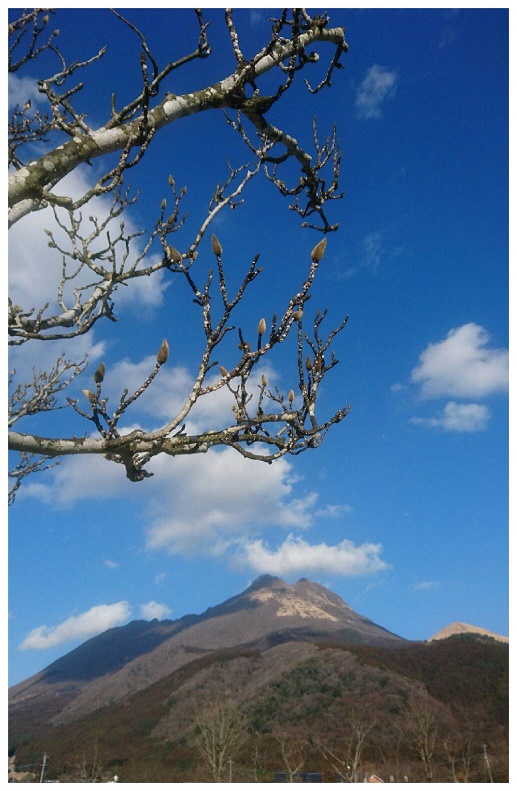 由布岳を背景にねこやなぎがさいて、冬らしさを感じます^^