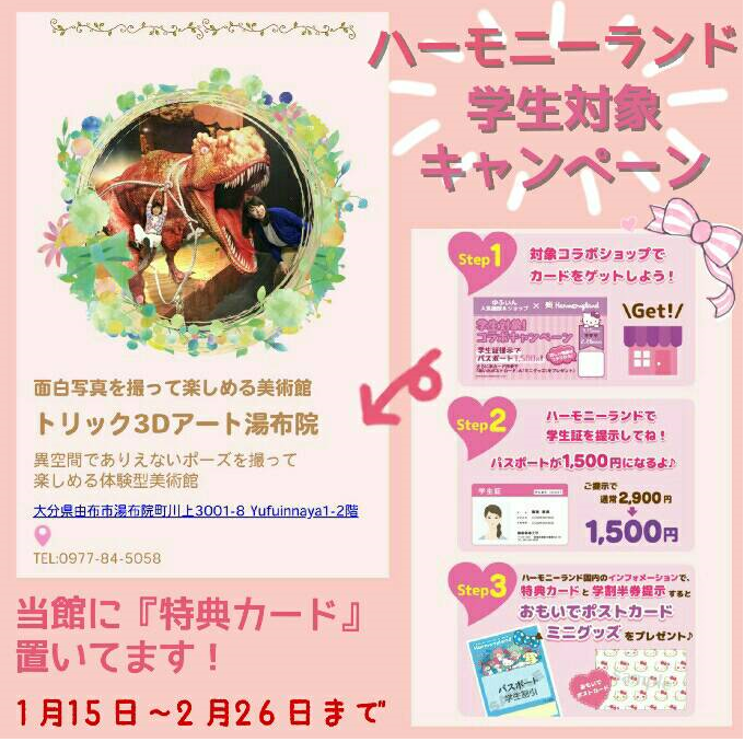 本日は学生の皆さんにお得な情報です!ハーモニーランドと湯布院のお店がコラボして学生対象キャンペーンを開催します!(対象:中学生、高校生、大学生、短大生、大学院生、各種専門学生)