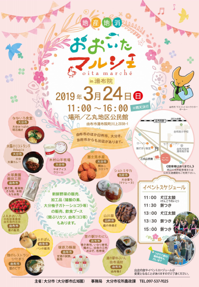 乙丸公民館駐車場で「おおいたマルシェin湯布院」が開催されます!地元の新鮮野菜、大分の特産品を使ったグルメ、パンやスイーツ等の販売や、犬江太鼓の披露、餅つき、つきたてお餅の無料配布も行われるそうです♪大分の魅力が盛りだくさんのイベントです!ぜひ立ち寄ってみてくださいね^^