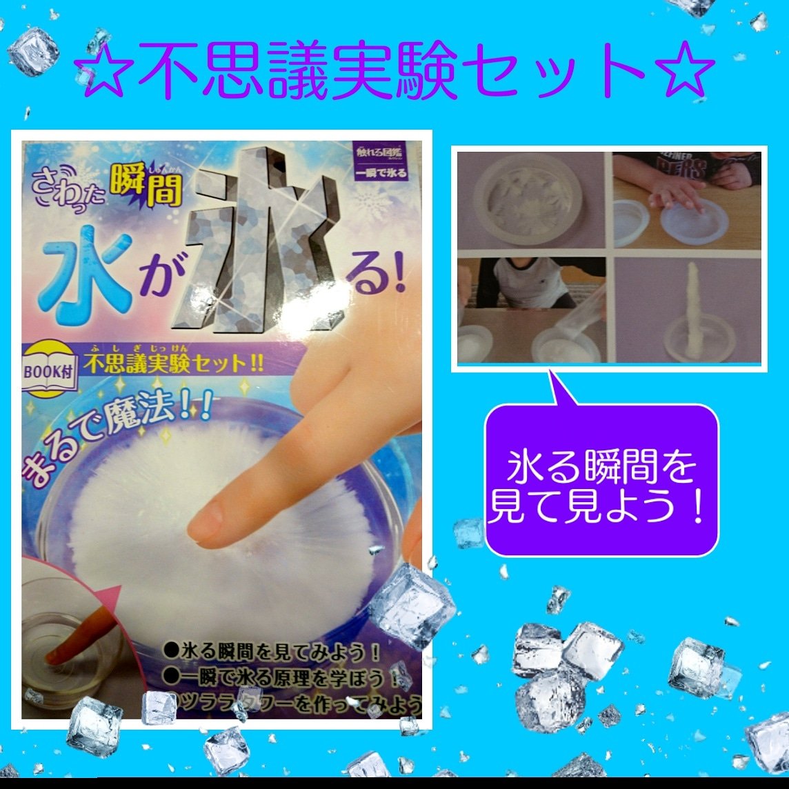 写真の『水が氷る!』は、キットの中の酢酸ナトリウムをつかって、水が一瞬にして氷ってしまう瞬間を見ることができますよ!